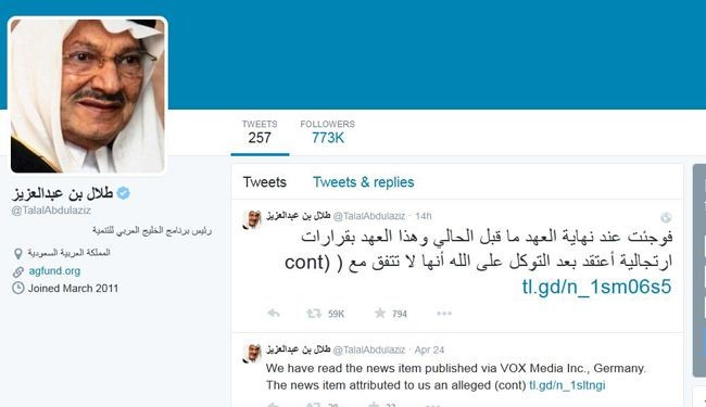 وكتب الأمير طلال في تغريدة له عبر حسابه على موقع (تويتر)، “فوجئت عند نهاية العهد ما قبل الحالي وهذا العهد بقرارات ارتجالية أعتقد بعد التوكل على الله أنها لا تتفق مع شريعتنا الإسلامية ولا أنظمة الدولة وسبق لي أن ذكرت في هذا الموقع أنه لا سمع ولا طاعة، وبالتالي لا بيعة لمن خالف هذا وذاك”.