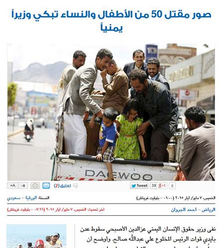 فداحة المشهد لم تنته هنا. ارتأت صحيفة “الحياة” أن أشلاء الأطفال تحتمل بعد القتل، الاستغلال. فاستخدمت الصحيفة احدى هذه الصور تحت عنوان “صور مقتل 50 من الأطفال والنساء تبكي وزيراً يمنياً”، ملمّحة أنّها تعود لأطفال قتلتهم حركة “انصار الله” على شاطي عدن. في ايحاء للرأي العام أن هذه الحركة التي ثارت بدعم شعبي عارم على الاستبداد السعودي في اليمن، هي حركة تقتل الأطفال والأبرياء، علّها بذلك تقول للعالم أنّ “آل سعود” ليسوا وحدهم من يقتلون المدنيين ويرتكبون المجازر بحقهم.. صدقت الصحيفة.. لدى آل سعود وكيان العدو الاسرائيلي الحقد نفسه.. وآلة القتل عينها.