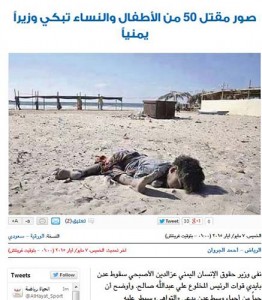 فداحة المشهد لم تنته هنا. ارتأت صحيفة “الحياة” أن أشلاء الأطفال تحتمل بعد القتل، الاستغلال. فاستخدمت الصحيفة احدى هذه الصور تحت عنوان “صور مقتل 50 من الأطفال والنساء تبكي وزيراً يمنياً”، ملمّحة أنّها تعود لأطفال قتلتهم حركة “انصار الله” على شاطي عدن. في ايحاء للرأي العام أن هذه الحركة التي ثارت بدعم شعبي عارم على الاستبداد السعودي في اليمن، هي حركة تقتل الأطفال والأبرياء، علّها بذلك تقول للعالم أنّ “آل سعود” ليسوا وحدهم من يقتلون المدنيين ويرتكبون المجازر بحقهم.. صدقت الصحيفة.. لدى آل سعود وكيان العدو الاسرائيلي الحقد نفسه.. وآلة القتل عينها.