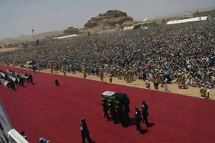 بمراسم شبة عسكرية وفي جنازة مهيبة حضرها مختلف شرائح المجتمع من كافة المحافظات اليمنية، شيع محبي واتباع “حسين الحوثي” رفاته بعد 9 سنوات من مقتله حيث كان محتجز لدى وزارة الدفاع اليمنية منذ مقتله، وتم تسليمه بناء على اشتراط الجماعة على الرئاسة اليمنية تسليم رفاته كشرط لمشاركتهم في مؤتمر الحوار الوطني، حيث تم حمله في تابوت مغلق يحمله سته أشخاص بلباس شبه عسكري، يسيرون على بساط أحمر بذات المراسم العالمية.