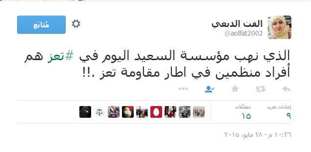 من جانبها، قالت القيادية البارزة في حزب الإصلاح، ألفت الدبعي، في تغريدة بحسابها الشخصي على تويتر: “إن الذي نهب مؤسسة السعيد في تعز هم أفراد منظمين في اطار مقاومة تعز .!!”