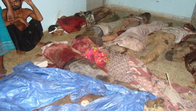 وأوضح المصدر ” أن عدد من جثث الشهداء لم يتم التعرف عليها إلا في مراحل لاحقة ومنها شهداء أسرة الشهيد صادق عبدالله صالح القدسي البالغ من العمر 49 عاماً و زوجته انتصار قائد البالغة من العمر 37 عاماً و أطفاله الخمسة أحمد وعبدالله وأسماء ونبيهة ومحمد الذين تتراوح أعمارهم بين 5-16 عاماً, استشهدوا جميعاً في الغارات العدوانية على المدينة السكينة.