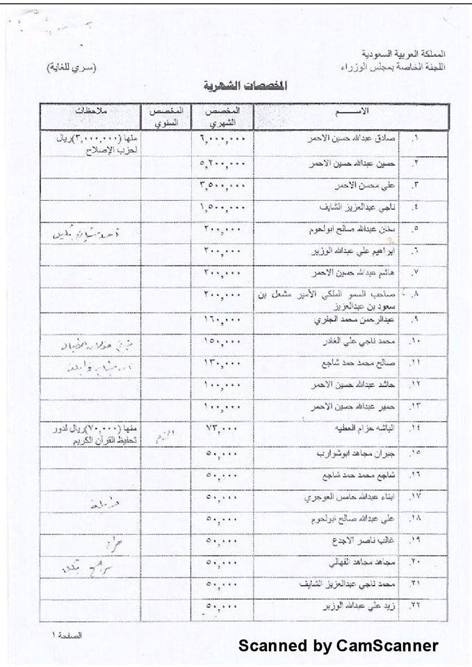وكشف تقرير الصحيفة أن 40 مليون ريال سعودي کانت تدفع للرئيس اليمني السابق علي عبد الله صالح و3 ملايين ريال سعودي للشيخ صادق الأحمر و3 ملايين ريال سعودي لعلي محسن الأحمر بالإضافة إلى استلام الأخير 10 مليون ريال سعودي أيضاً سنوياً من وزارة الدفاع السعودية تحت بند “محاربة الروافض”.