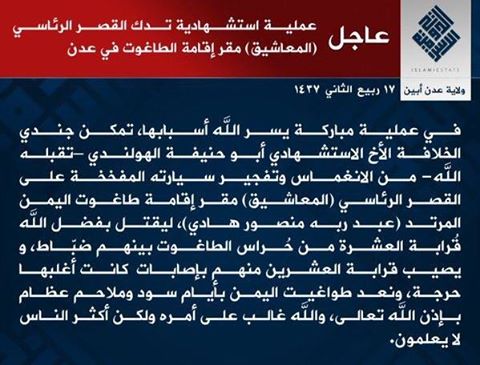 أعلن تنظيم (داعش) الإرهابي تبنية للعملية الإنتحارية التي أستهدفت اليوم البوابة الشرقية للقصر الرئاسي بمعاشيق عدن ، هذا وقد سقط عشرات القتلى والجرحى في إستهداف سيارة مفخخة يقودها إنتحاري يسمى أبو حنيفة الهولندي سقط على إثرها عشرات القتلى والجرحى من الجنود الذي كانوا يقومون بحراسة القصر الرئاسي ، ويأتي غعلان داعش هذا لتبنية لهذه العملية تأكيدا لوجود هذا التنظيم وبقوة في المحافظات الجنوبية بعد الإنكار المتعمد من قبل وسائل إعلام العدوان ..