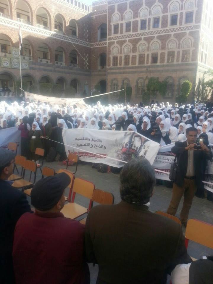 ونددت الطالبات في الوقفة بعبارت تظمنت إن أمريكا هي من تقتل الشعب اليمني وهي أم الإرهاب.