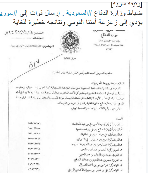 وحذّر القادة العسكريون السعوديون في رسالتهم من أنّ إرسال قوات سعودية إلَى سوريا سيؤدي إلَى زعزعة استقرار الأمن القومي السعودي وستترتب عليه نتائج خطيرة للغاية، مطالبين بمزيد من الدراسة.