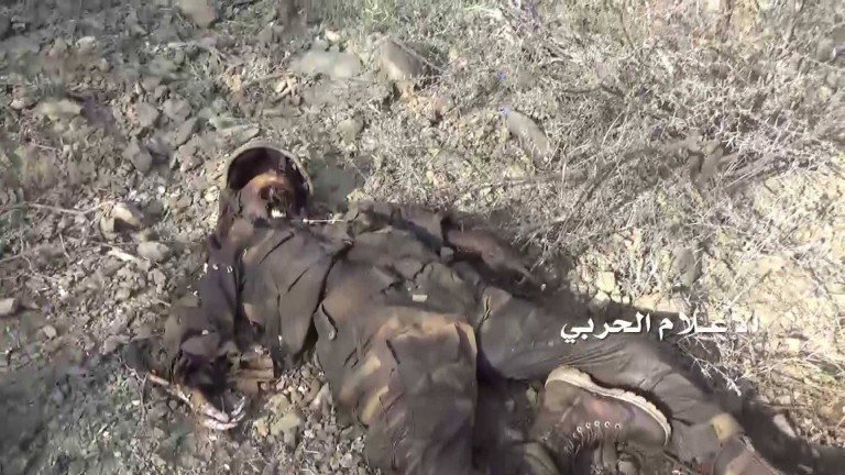 وحسب المشاهد التي وزعت” تظهر جثة الجندي السعودي التي عثر عليها أبطال الجيش واللجان الشعبية في أحد المواقع في جبل الدود في جيزان بعد أن خلفها الجيش السعودي” .