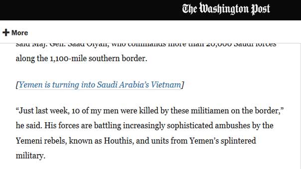 نشرت صحيفة “واشنطن بوست الأمريكية” تقريراً ميدانياً، كتبه مراسلها هيو نايلور، من نجران جنوب السعودية، يصف الهجمات اليمنية على السعودية بالقاتلة. وقال التقرير، إن “الآلاف من القوات السعودية تم نشرها على طول التلال جنوب البلاد، تكافح من أجل وقف الهجمات عبر الحدود من جانب المقاتلين اليمنيين الذين يطلقون الصواريخ بكثافة وينفذون عمليات برية قاتلة”.
