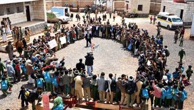 صنعاء : طلاب وطالبات ومعلمو مدرسة السواري في بني مطر ينددون باستمرار العدوان