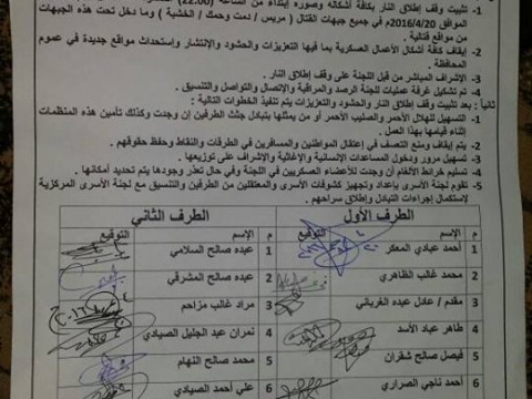 مصادرُ محلية أكدت أن اللجنة المكلفة بمراقبة وقف إطْـلَاق النار المكونة من الأطراف المحلية في المحافظة اجتمعت يوم أمسٍ الأربعاء 20 إبريل، ووقّعت اتفاقا ًمكوَّناً من نقطتين رئيسيتين، تنصُّ الأولى على تثبيتِ وقف إطْـلَاق النار بشكل كامل وشامل ابتداءً من الساعة العاشرة من مساء الأربعاء، في مريس ودمت والخشبة، وهي المناطقُ التي تشهَدُ مواجهاتٍ ميدانيةً في المحافظة.