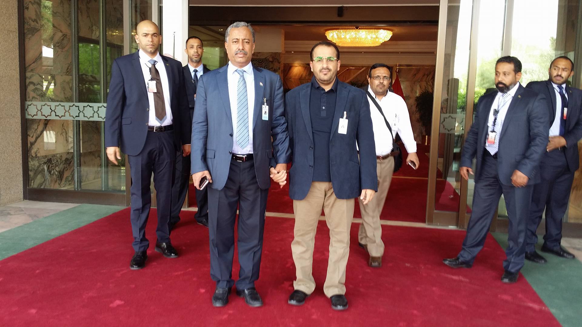 محمد عبدالسلام وعارف الزوكا خلال توجُّههما للجلسة الصباحية قبل قليل والمخصصة لرؤوساء الوفود