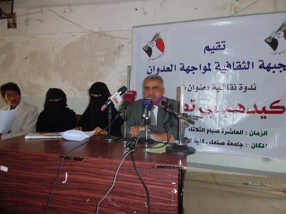 أقامتِ الجبهةُ الثقافيةُ لمواجهةِ العُـدْوَان، اليومَ الثلاثاءَ 3 مايو 2016، ندوةً فكريةً ونقاشيةً بعنوان “كيدُهم في تضليل” بقاعة الوحدة كلية الإعْـلَام بجامعة صنعاء.