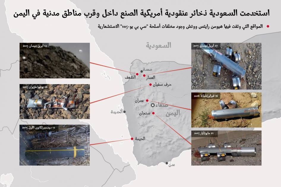هيومن رايتس ووتش : السعودية تقصف اليمن بذخائر عنقودية أمريكية و يجب إنهاء إنتاج ونقل هذه الأسلحة المحظورة