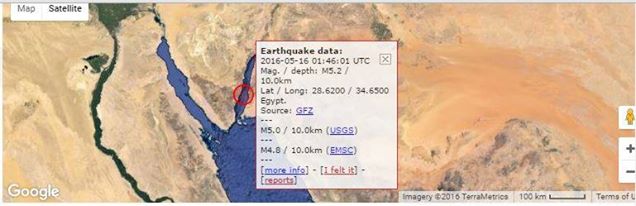 ووقعت الهزة التي لم تتجاوز بضع ثوان في تمام الساعة 4.46 فجرا بتوقيت مكة المكرمة وشعر بها سكان تبوك ومصر وقطاع غزة والأردن .