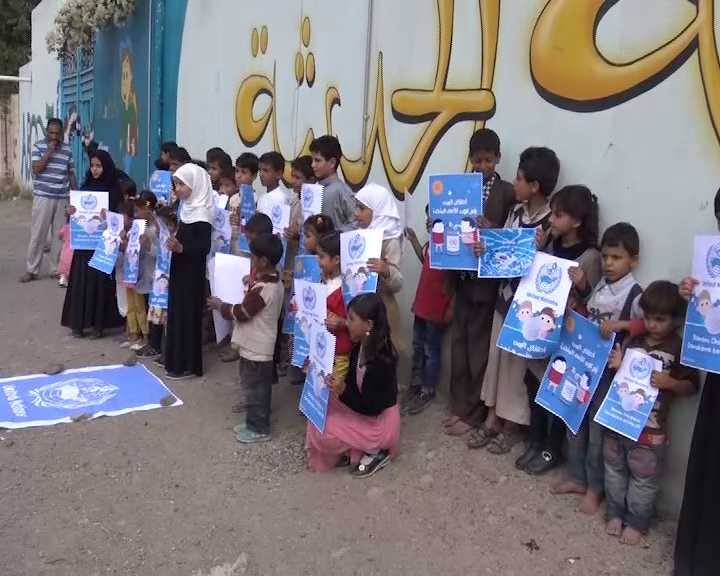 كما نفذ أطفال دمنة خدير بمحافظة تعز وقفة احتجاجية تنديداً بموقف الأمم المتحدة وللمشاركة في حملة تبرعات الأطفال لرفد خزينة هذه المنظمة التي باعت أطفال اليمن مقابل المال السعودي .