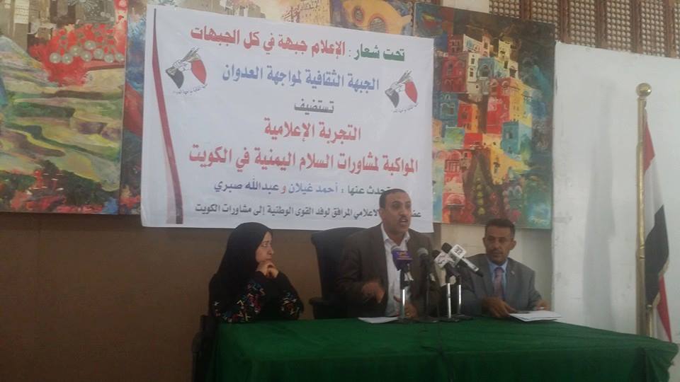 تحت شعار “الإعلام جبهة في كل الجبهات” استضافت الجبهة الثقافية لمواجهة العدوان أمس في بيت الثقافة بصنعاء عضوا الوفد الإعلامي المرافق لوفد القوى الوطنية إلى مشاورات الكويت الزميل عبدالله صبري – رئيس اتحاد الإعلاميين اليمنيين، والإعلامي أحمد غيلان –رئيس تحرير صحيفة الجمهور.