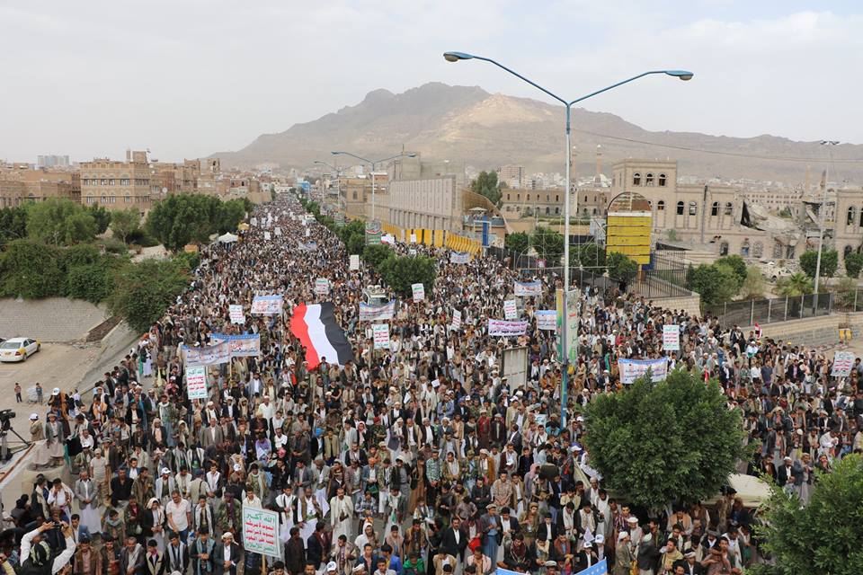 شهدت العاصمة صنعاء عصر اليوم بساحة باب اليمن مسيرة جماهيرية حاشدة للتنديد باستمرار العدوان والمواقف الأمريكية المعرقلة للحوار والحلول السلمية تحت شعار ” أمريكا ترفض الحل السلمي في اليمن “.