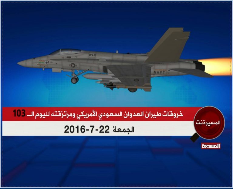واصل طيران العدوان السعودي الأمريكي، اليوم الجمعة 22 يوليو 2016م ، شن غاراته وتحليقه وخروقه في عدد من المحافظات بالتزامن مع الخروق المتواصلة لمرتزقته.