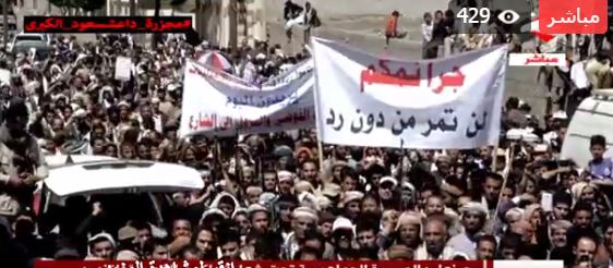 هذا واحتشد الآلاف من المواطنين مقابل مقر الأمم المتحدة بالعاصمة صنعاء في المسيرة الجماهيرية الكبرى (براكين الغضب) غضباً لشهداء مجزرة الصالة الكبرى التي ارتكبها العدوان يوم أمس الأحد ودعى لتنظيمها المجلس السياسي الأعلى.