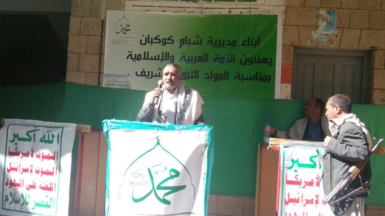 وفي المهرجان الذي حضرة مدير مكتب التربية والتعليم بالمديرية احمد علي العصيمي دعاء امين عام المجلس المحلي بالمديرية احمد الولي والاستاذ علي حسين عبد الكريم المواطنين الى مزيد من التلاحم والاصطفاف لمواجهة ماتتعرض لة الامة من حرب صهيونية صليبية ناقمة تستهدف النيل من الاسلام والمسلمين