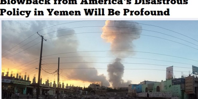 المجلة الأمريكية نشرت تقريراً مطولاً حول العدوان السعودي الأمريكي على اليمن، بعنوان ” رد الفعل جراء سياسة أميركا الكارثية في اليمن سيكون شديدا”، وقالت إن الحرب على اليمن تحظى بالقليل من الاهتمام في وسائل الإعلام، ورأت في ذات الوقت أن رد الفعل جراء سياسة الولايات المتحدة في اليمن التي تدعم الحرب السعودية في البلد الذي ستكون تداعياته شديدة لكل من المنطقة وربما للولايات المتحدة أيضا.