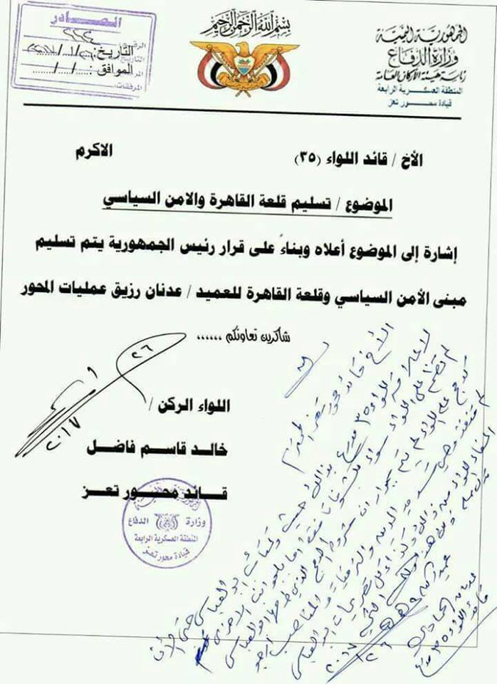 وفي سياق متصل، حصل “العربي” على نسخة من توجيه قائد محور تعز في القوات الموالية للرئيس هادي، اللواء الركن خالد فاضل، للعميد عدنان الحمادي، قائد لواء 35، بتسليم قلعة القاهرة ومبنى الأمن السياسي إلى العميد عدنان رزيق، قائد عمليات محور تعز، وذلك حسب توجيه رئيس الجمهورية عبد ربه منصور هادي.
