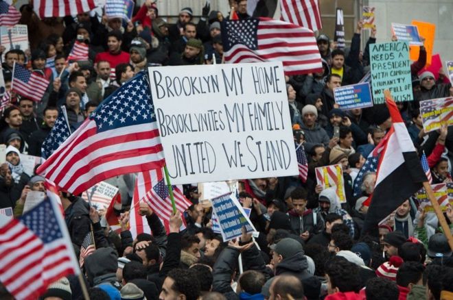 • أمريكيون من أصل يمني يتجمعون خارج مبنى بلدية بروكلين رفضا لحظر السفر الذي فرضه الرئيس الأمريكي دونالد ترامب