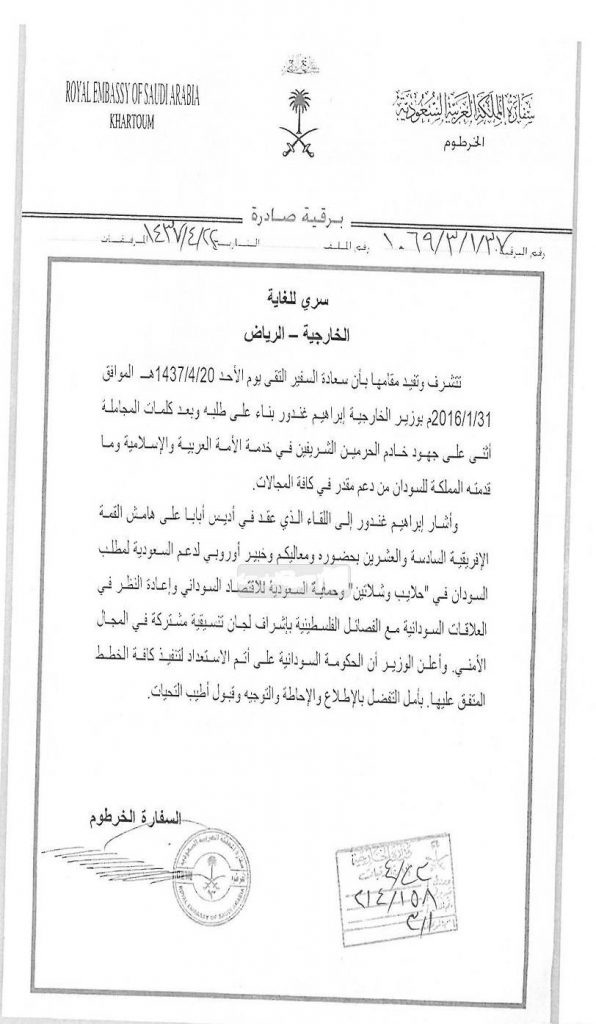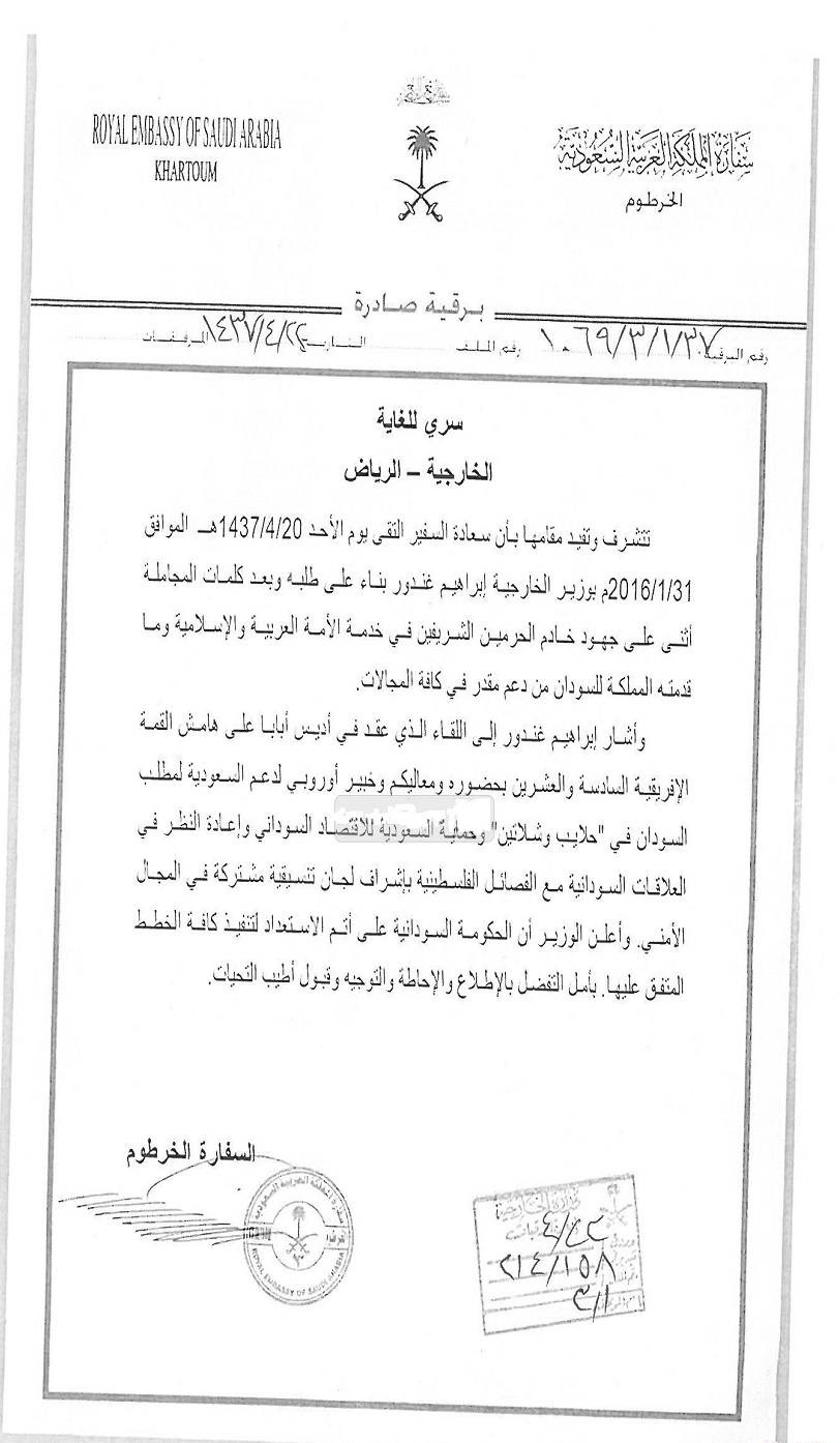 ووفقا للوثيقة المسربة من الخارجية السعودية التقى السفير السعودي بالخرطوم، يوم الأحد 31/01/2016، بإبراهيم غندور وزير الخارجية السوداني بناء على طلب الأخير، وأفصحت الوثيقة عن شكر غندور لدعم الملك سلمان للسودان في حلايب وشلاتين.