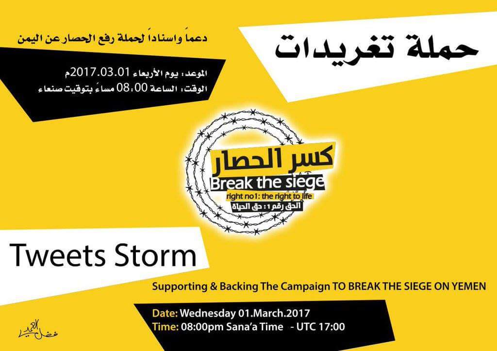 ودعا المنظمون للحملة جميع الناشطين والمشتركين في موقع “تويتر” إلى المشاركة الفاعلة بحملة تغريدات دعماً وإسناداً لحملة رفع الحصار عن اليمن.