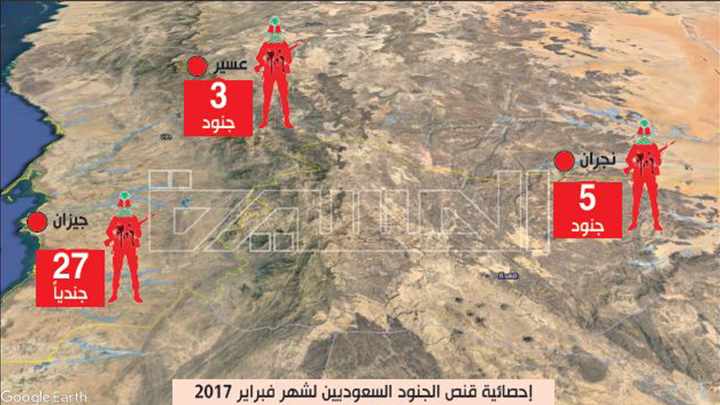 وتظهر البياناتُ التالية عملياتِ القنص التي استهدفت جنودًا سعوديين خلال شهر فبراير الماضي والمواقع التي تم استهدافهم فيها: