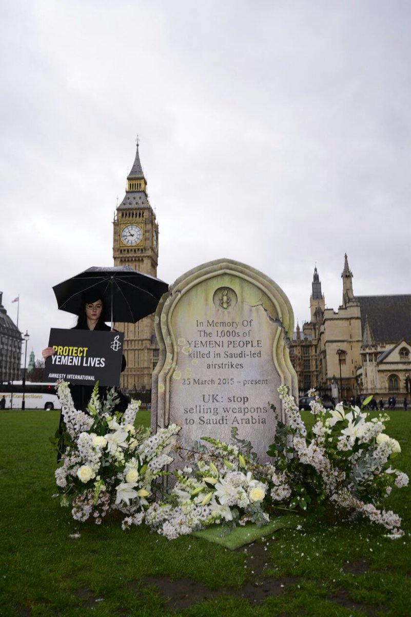 قام مكتب منظمة العفو الدولية في المملكة المتحدة بنصب شاهد قبر حجري لتخليد ذكرى الضحايا الذين قتلهم تحالف العدوان السعودي الأمريكي بقنابل وأسلحة بريطانية.