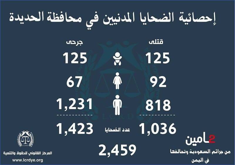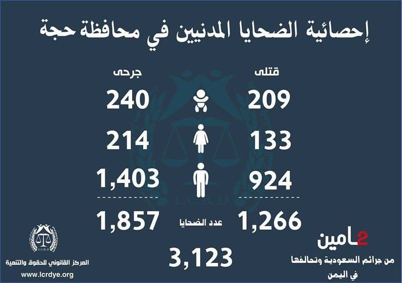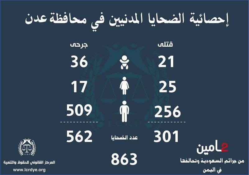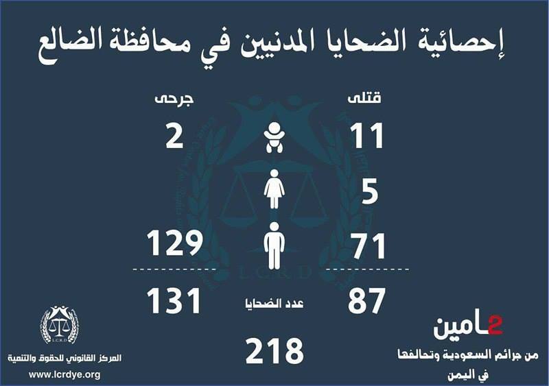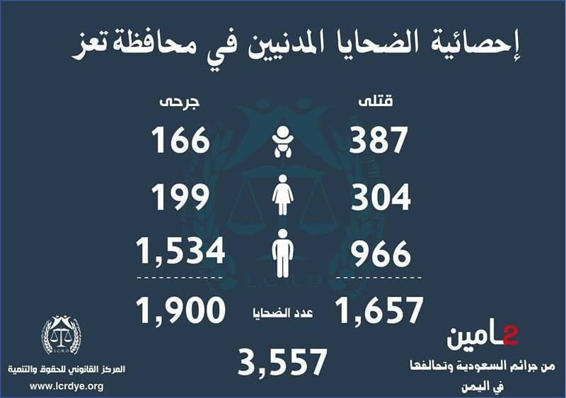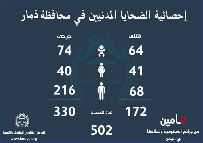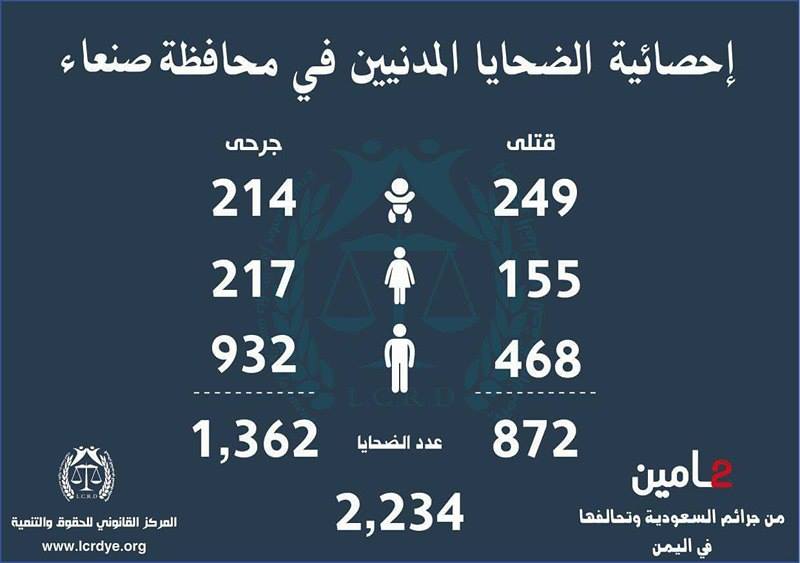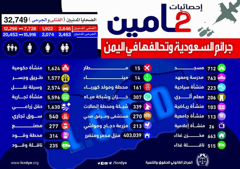إنفوجرافيك| احصائيات لجرائم السعودية وتحالفها في اليمن خلال عامين On مارس 25, 2017 843 Share متابعات | إنفوجرافيك تالياً الاحصائية الصادرة عن المركز القانوني للحقوق والتنمية حول جرائم التحالف السعودي الأمريكي في اليمن خلال عامين 843 Share FacebookTwitterGoogle+ReddItWhatsAppPinterestEmail