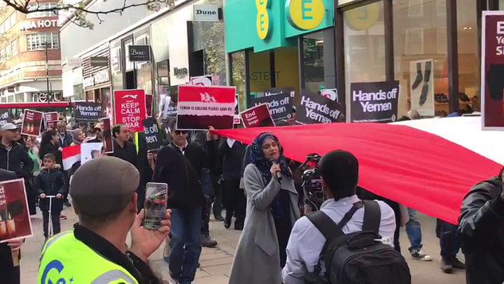 شهدت العاصمة البريطانية لندن اليوم الأحد مسيرة ووقفة احتجاجية نظمتها عدد من المنظمات الدولية تضامنا مع الشعب اليمني في ذكرى مرور عامين من العدوان على اليمن.