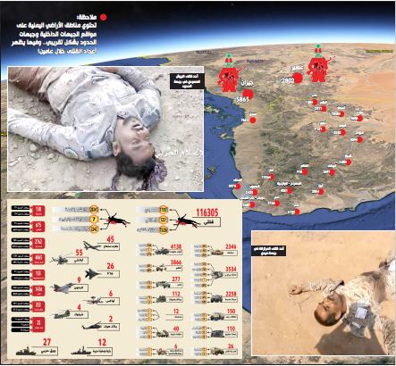 وخلال عامين من هذه المواجهة، لقي ما يزيد على 116305 من جنود ومرتزقة العدو مصارعَهم، بنيران أبطال الجيش واللجان الشعبية، منهم ما يزيد عن 17357 ضابطاً وجندياً سعودياً، 16494 منهم في نجران وجيزان وعسير.