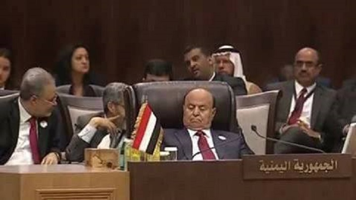 أولهما، التقطت عدسات كاميرات الجلسة الافتتاحية للقمة العربية الـ 28 بالأردن، للفار عبد ربه منصور هادي، نائماً خلال إلقاء الأمين العام لجامعة الدول العربية السفير أحمد أبو الغيط، كلمته.