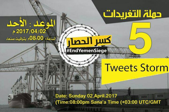 انطلقت مساء اليوم الأحد حملة تغريدات على موقع التواصل الاجتماعي “تويتر” لكسر الحصار الذي يفرضه تحالف العدوان السعودي الأمريكي على اليمن.