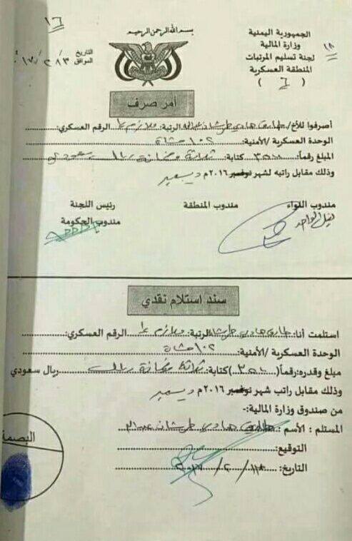 الوثيقة الأولى تثبت المبالغ المالية التي يتقاضاها ابن أحد قيادات ما يُسمّى بالشرعية من المنطقة العسكرية الخامسة والسادسة ، برقمين عسكريين مختلفين احدها صادرة من المنطقة العسكرية الخامسة والاخرى من المنطقة العسكرية السادسة.