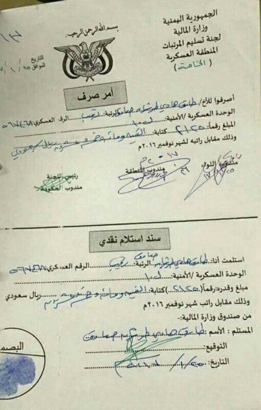 الوثيقة الأولى تثبت المبالغ المالية التي يتقاضاها ابن أحد قيادات ما يُسمّى بالشرعية من المنطقة العسكرية الخامسة والسادسة ، برقمين عسكريين مختلفين احدها صادرة من المنطقة العسكرية الخامسة والاخرى من المنطقة العسكرية السادسة.