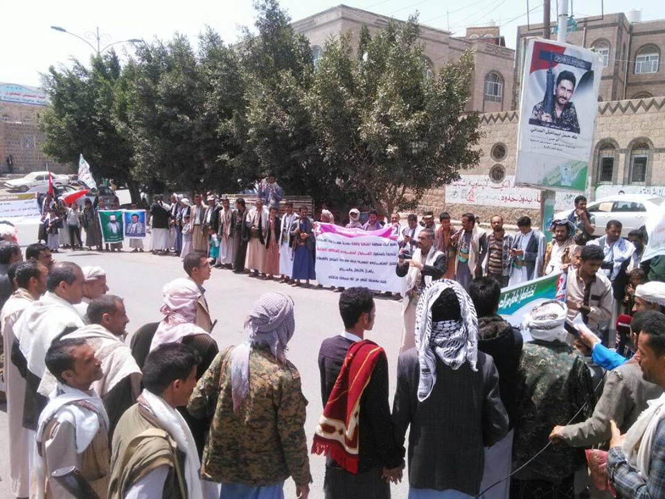 نظم ابناء حي نعمان بمدينة حجة بعد صلاة اليوم الجمعة وقفة احتجاجية أمام مبنى إدارة أمن محافظة حجة تنديدا باستمرار  العدوان السعودي الامريكي والحصار المفروض على الشعب اليمني الذي دخل عامه الثالث.