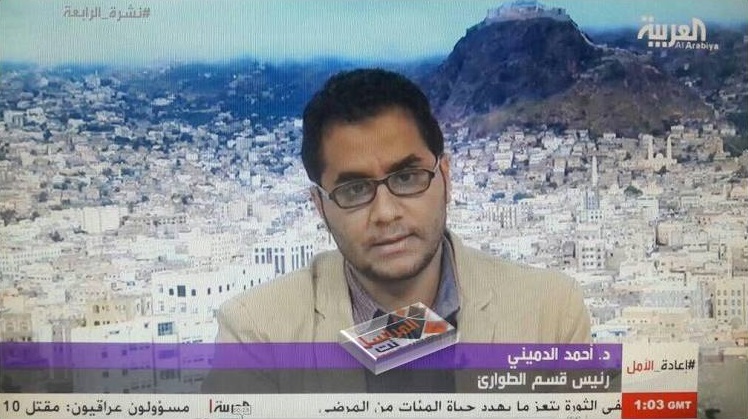 ورصد المراسل نت مداخلة مدير قسم الطوارئ بمستشفى الثورة في تعز الدكتور أحمد الدميني مع قناة العربية والتي قال فيها أن الوضع الصحي متدهور لانقطاع الميزانية الخاصة بقطاع الصحة.