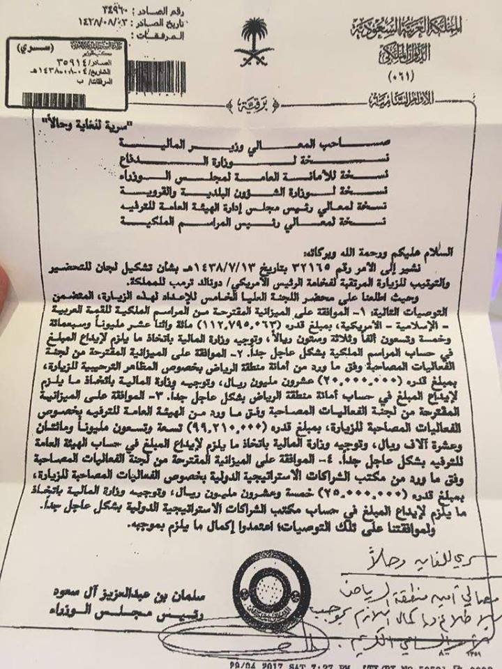 الوثيقة التي حملت توقيع الملك السعودي سلمان بن عبدالعزيز، تظهر أن الديوان الملكي السعودي أمر بصرف أكثر من ثمانية وستين مليون دولار أميركي على مراسم استقبال ترامب، موزعة على مراسم القمة العربية الإسلامية الأميركية، والمراسم الترحيبية بالزيارة، ومصاريف الترفيه بالإضافة إلى الفعاليات المصاحبة للزيارة وفق ما ورد في الوثيقة.