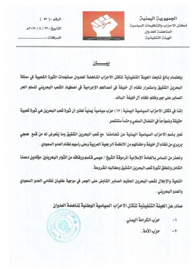 أدانت الهيئة التنفيذية لتكتل الاحزاب السياسية اليمنية المناهضة للعدوان السعودي الامريكي استمرار نظام ال خليفة البحريني واعمالهم الإجرامية بحق أبناء شعب البحرين الشقيق وما يتعرضون له من قمع همجي بربري من نظام ال خليفة وحلفائهم من الانظمة الرجعية وعلى رأسهم نظام العدو السعودي واضطهادهم في ثورتهم الشعبية.