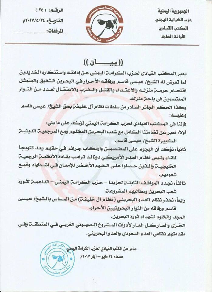 الى ذلك عبر المكتب القيادي لحزب الكرامة اليمني عن إدانته واستنكاره الشديدين لما تعرض له الشيخ عيسى قاسم ورفقاه الاحرار إثر قيام السلطات البحرينية اقتحام منزله والاعتداء بالقتل والضرب والاعتقال لعدد من الثور المعتصمين في باحة منزلة بالإضافة الى الحكم الجائر الصادر بحقه من قبل سلطات نظام ال خليفة.