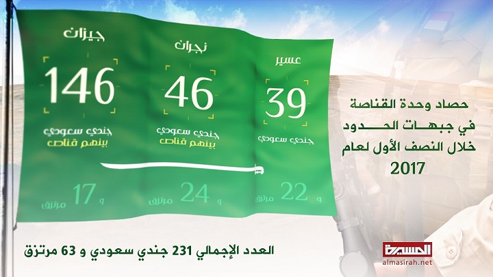 وفي إحصائية جديدة لـ “المسيرة نت”، حصدت وحدة القناصة اليمنية خلال النصف الأول من العام الجاري 2017م، 231  جندياً سعودياً و63 مرتزقاً في جبهات جيزان ونجران وعسير.