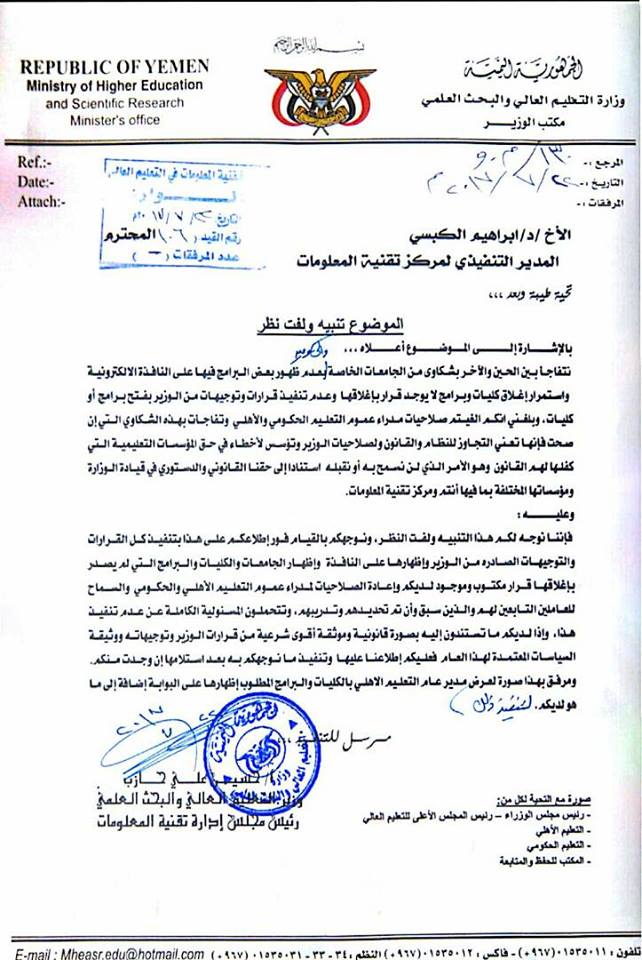 وكان الوزير حازب وجه إنذارا شديد اللهجة الاسبوع الماضي لمدير مركز تقنية المعلومات وهدده بالإطاحة به من منصبه اذا لم ينفذ توجيهاته المخالفة للقانون بإضافة البرامج للبوابة الالكترونية والمنظورة قراراتها بقضية التزوير أمام الجهات الرقابية والقضائية ومنها هيئة مكافحة الفساد ومباحث الأموال العامة ونيابة الأموال العامة ووجهت النيابة العامة بإيقاف العمل بتلك التراخيص.