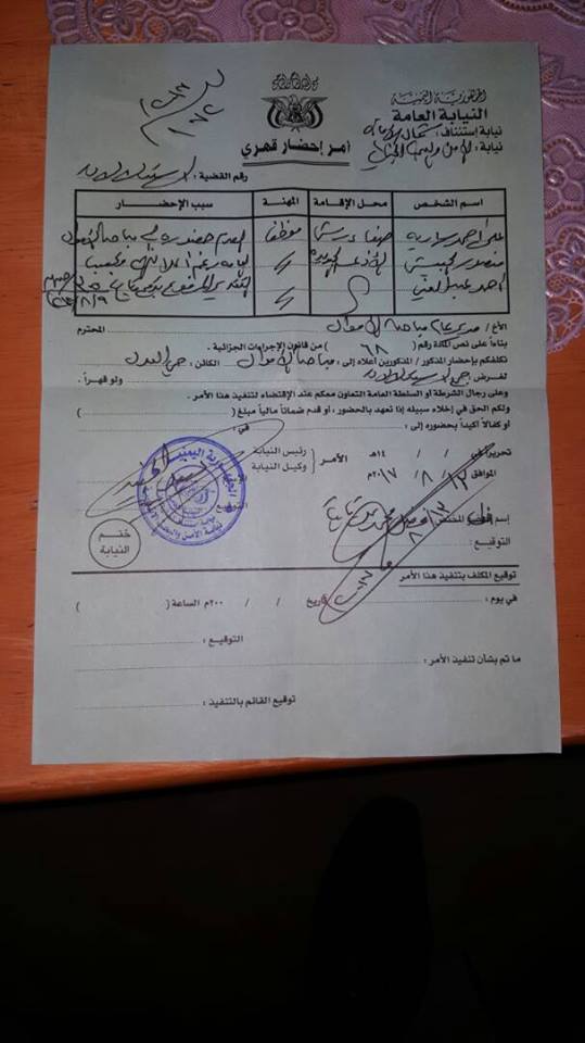 وتؤكد مذكرة النيابة العامة على الاحضار القهري لثلاثة من قيادات الادارة العامة للطوارئ بالوزارة وذلك في اطار التحقيق في قضية اختلاس قرابة 3مليارات ريال من دعم المنظمات الدولية وذلك بالاتفاق كما تؤكد مصادر صحية موثوقة مع وزير الصحة العامة والسكان الدكتور محمد سالم بن حفيظ حيث تم الاستيلاء على هذا المبلغ الكبير تحت مسمى “انشطة وبرامج” وهمية.