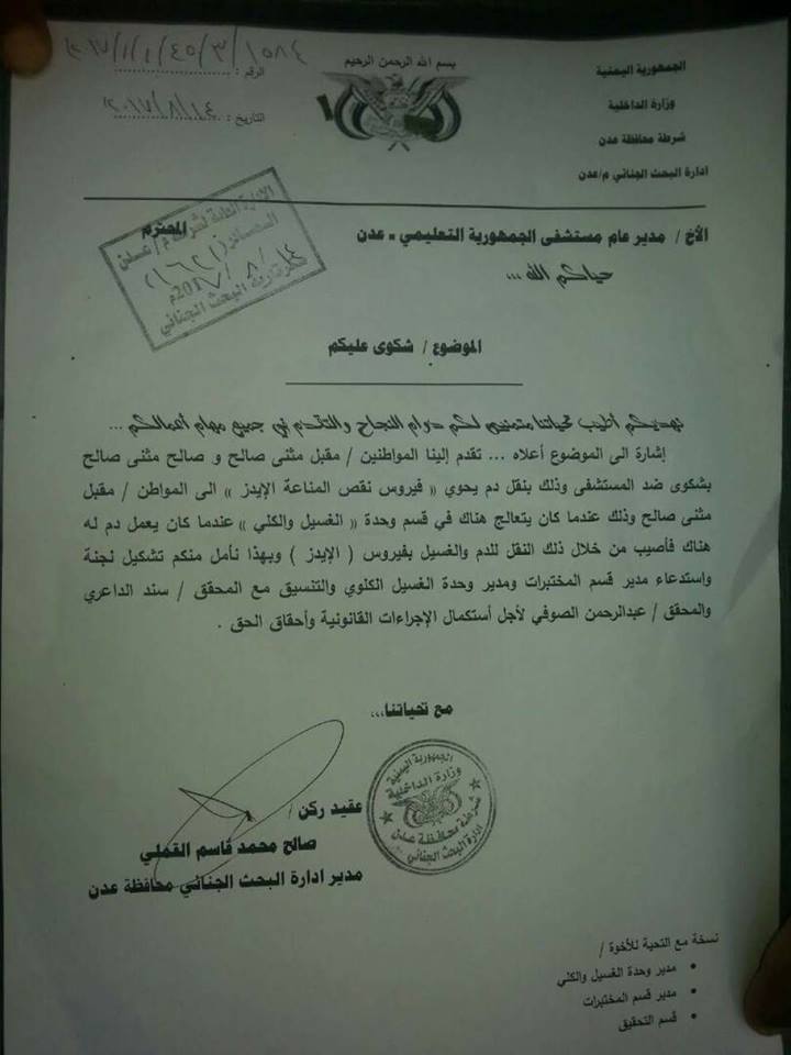 وفي وثيقة حصل “متابعات” على نسخة منها ، صادرة من أحد أقسام الشرطة أشارت إلى أن المواطن “مقبل مثنى صالح” والمواطن “صالح مثنى صالح” تقدّما بشكوى ضد مستشفى الجمهورية التعليمي بنقل دم يحوي “فيروس نقص المناعة – الإيدز” إلى المواطن مقبل مثنّى صالح في قسم الغسيل الكلوي.