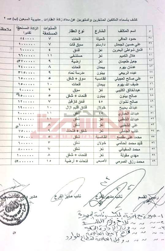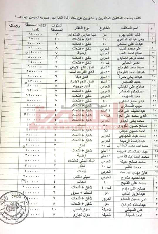 وكشفت وثيقةٌ مرفقةٌ للمذكرة الرسمية، عن عدد العمارات والفلل التي يمتلكها النافذون والفاسدون في مديرية السبعين فقط، بالإضافة إلى حجم المبالغ الكبيرة المستحقة عليهم منذ ما يقارب 12 عاماً، حيث أشارَت وثيقةُ مكتب الواجبات الزكوية إلى 29 اسماً لتلك الشخصيات الممتنعة أبرزهم (محمد رزق الصرمي – الذي يمتلك في منطقة عطان بمديرية السبعين العديدَ من الفلل والعمارات، وتُقدَّرُ المبالغُ المستحقةُ عليها للزكاة ما يقارب 50 مليون ريال)، بالإضافة إلى (فضل القوسي – الذي يمتلك فلتين بمنطقة عطان، وتقدر المبالغ المستحقة عليه للزكاة ما يقارب 2 مليون ريال)، وكذا (مهدي مقولة – الذي يمتلك فلتين بمنطقة حدة وتقدر المبالغ المستحقة عليه للزكاة 3 ملايين ريال)، كما يحوي الكشفُ اسم (سنان ابو لحوم – الذي يملك العديد من الفلل والعمارات بمنطقة حدة، وتقدر المبالغ المستحقة عليه للزكاة حوالي 70 مليون ريال) وَ(رشاد العليمي – الّذي يمتلك العديد من الفلل والعمارات بمنطقتَي حدة وعطان وتقدر المبالغ المستحقة علية للزكاة 7 ملايين ريال) وَ(علي مقصع – الذي يمتلك عمارةً في منطقة حدة، وتقدر المبالغ المستحقة عليه للزكاة حوالي مليون ونصف ريال) وَ(محمد ناجي القوسي – الذي يمتلك فلتين في منطقة، عطان وتقدر المبالغ المستحقة عليه للزكاة حوالي 2 مليون ريال) وَ(بسّام الشاطر – الذي يمتلك فلّة وعمارة في منطقة حدة، وتقدر المبالغ المستحقة عليه للزكاة حوالي 4 ملايين ريال) وَ(علي المطري – الذي يمتلك العديد من الفلل والعمارات في منطقة حدة، وتقدر المبالغ المستحقة عليه للزكاة حوالي 20 مليون ريال) و(محمد الغادر – الذي يمتلك فلّتين في منطقة حدة، وتقدر المبالغ المستحقة عليه للزكاة حوالي 5 ملايين ريال) وَ(جعبل طعيمان – الذي يمتلك عمارةً في منطقة حدة، وتقدر المبالغ المستحقة عليه للزكاة حوالي 2 مليون ريال) وَ(محمد السياني – الذي يمتلك أسواقاً تجارية في منطقتَي حدة وشارع 26 سبتمبر، وتقدر المبالغ المستحقة عليه للزكاة حوالي 10 ملايين ريال) وَ(توفيق عبدالرحيم – الذي يمتلك العديد من الفلل في منطقتي حدة وعطان، وتقدر المبالغ المستحقة عليه للزكاة حوالي 4 ملايين ريال) وَ(توفيق الخامري – الذي يمتلك العديد من الفلل والعمارات في منطقة حدة، وتقدر المبالغ المستحقة عليه للزكاة حوالي 5 ملايين ريال) وَ(عبدالملك السياني – الذي يمتلك العديد من الفلل في منطقة حدة، وتقدر المبالغ المستحقة عليه للزكاة حوالي 2 مليون ريال) وَ(أحمد بن أحمد معياد- الذي يمتلكُ العديدَ من العمارات والأراضي في منطقتي بيت معياد وشارع الثلاثين، وتقدر المبالغ المستحقة عليه للزكاة حوالي 7 ملايين ريال) وَ(أحمد الدفعي – الذي يمتلك العديد من الفلل بمنطقة حدة، وتقدر المبالغ المستحقة عليه للزكاة حوالي مليون ريال) وَ(علي صالح القلمي – الذي يمتلك مقرَّ السفارة الألمانية بمنطقة حدة، وتقدر المبالغ المستحقة عليه للزكاة حوالي 12 مليون ريال) وَ(محمد علي عذبان – الذي يمتلكُ العديد من الفلل في منطقة حدة، وتقدر المبالغ المستحقة عليه للزكاة حوالي 10 ملايين ريال) وآخرين.