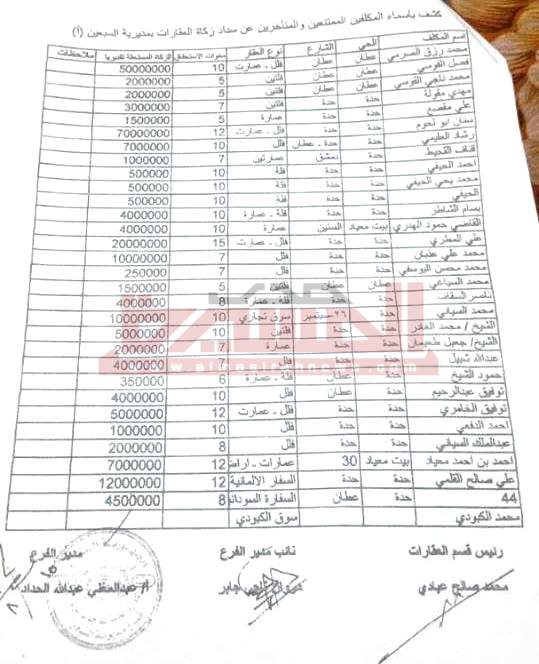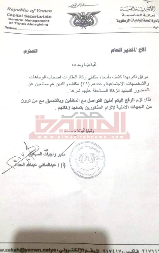 وفي وثيقة رسمية لمدير مكتب الواجبات بمديرية السبعين عبدالمغني عبدالله الحداد، بتأريخ 15 أغسطس الجاري، والمرفوعة إلى مدير عام الواجبات الزكوية بأمانة العاصمة، شكا من خلالها امتناع (29) شخصاً من كبار مكلفي زكاة العقارات من المسئولين السابقين وأصحاب الوجاهات والشخصيات العسكرية والأمنية والاجتماعية، عن الحضور لتسديد الزكاة المستحَقة عليهم شرعاً.
