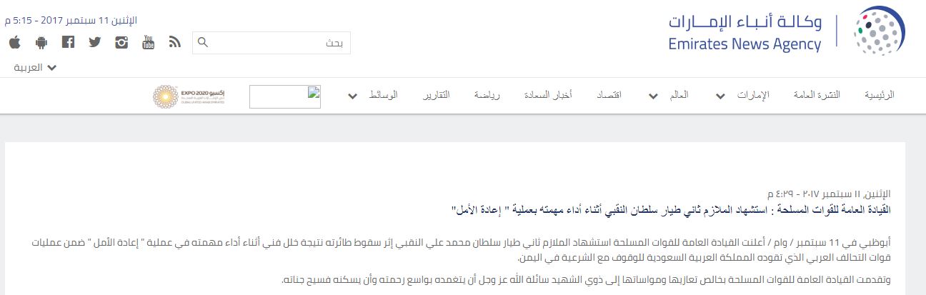 وحسب وكالة الأنباء الإماراتية الرسمية فإن القيادة العامة للقوات المسلحة الإماراتية أعلنت مقتل الملازم ثاني طيار سلطان محمد علي النقبي إثر سقوط طائرته نتيجة خلل فني في اليمن.”